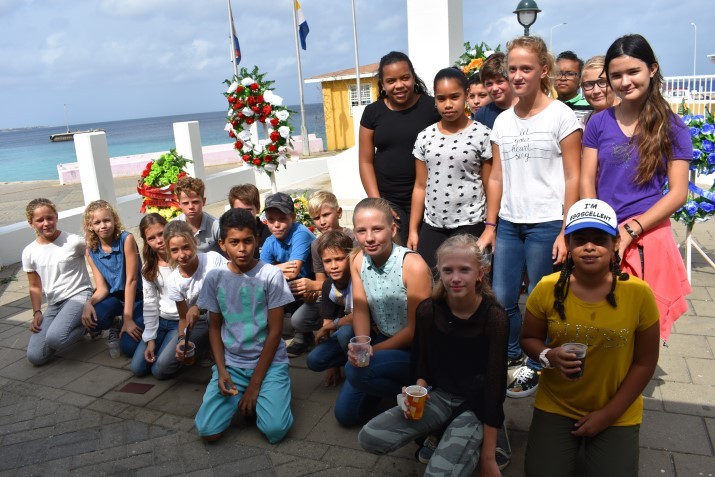 E aña aki e hóbennan di grupo 7 i 8 di e skol Aquamarin a para ketu na e konmemorashon di mortonan di guera. Nan a trese bunita frase dilanti bou di guia di nan dosentenan. Na final di e diskursonan a tuma lugá akto floral di parti diferente organisashon, Representante di Reino, Kuerpo Polisial, Duana, veteranonan militar i famianan di personanan ku a pèrdè nan bida durante e Segundo Guera Mundial. Foto ta mustra e alumnonan di e skol Aquamarin na e monumento.