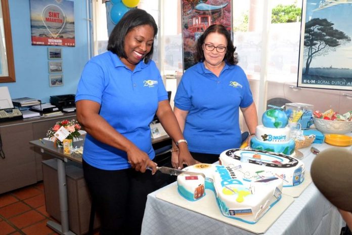 Bonaire Travel ku ayera a selebrá su di 20 aña di eksistensia i no kier a laga e okashon akí pasa bai sin mustra apresio pa e komunidat boneriano ku a sostené e agensia di biahe akí den tempu bon i tempu difísil i a hasi un donashon na Fundashon Kununku Kakelvers ku ta aktivo riba tereno di protekshon di animal. Riba e foto Marianella Fecunda i Natasja Statie-Gerharts na mesa di bolo.