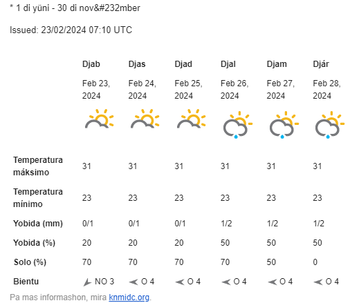 Lokal Pronóstiko di tempu pa Boneiru Djabièrnè 23 te Djasabra 24 Febrüari 2024 Periodo ku solo i predominantemente seku February 24, 2024 FacebookTwitterPinterestWhatsApp E kontenido aki ta solamente pa abonado Registrá Already a member? Log in here