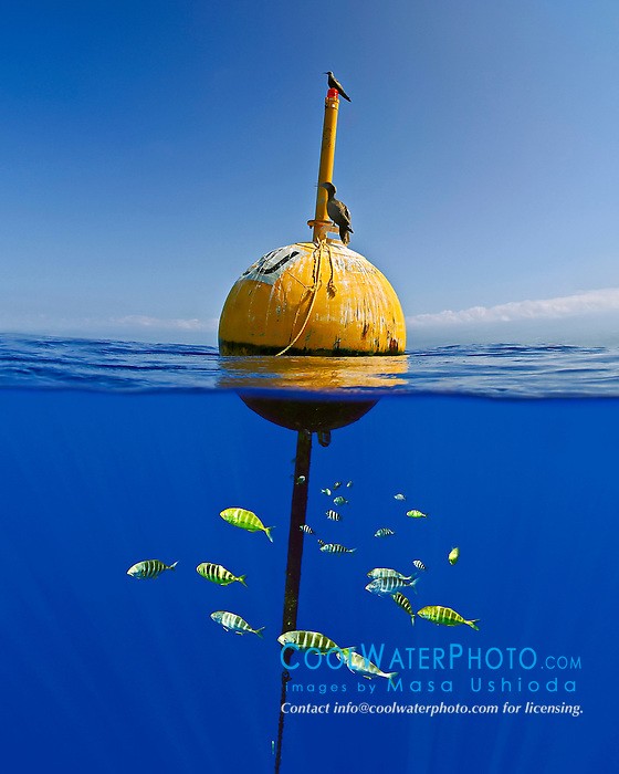 juvenile whitemouth jacks, Uraspis helvola, and endemic Hawaiian sergeants, Abudefduf abdominalis, sheltering under offshore FAD buoy - Fish Aggregation Device, while juvenile brown booby, Sula leucogaster, and noddy (tern), Anous sp., resting on the top of it, split view, Kona Coast, Big Island, Hawaii, USA, Pacific Ocean